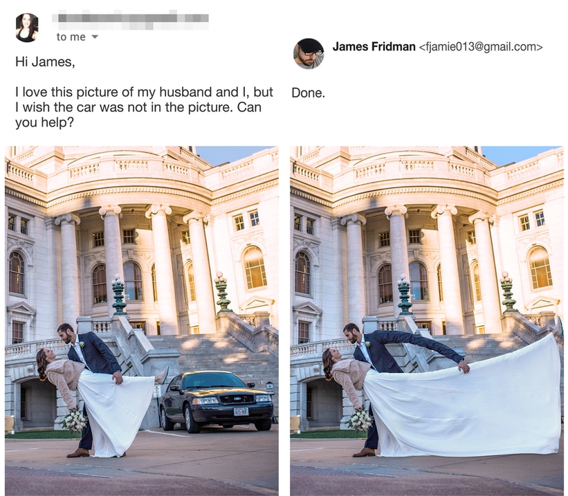 ▼「這是我的結婚照,但我不想看到後面的車,能幫幫忙嗎?」
