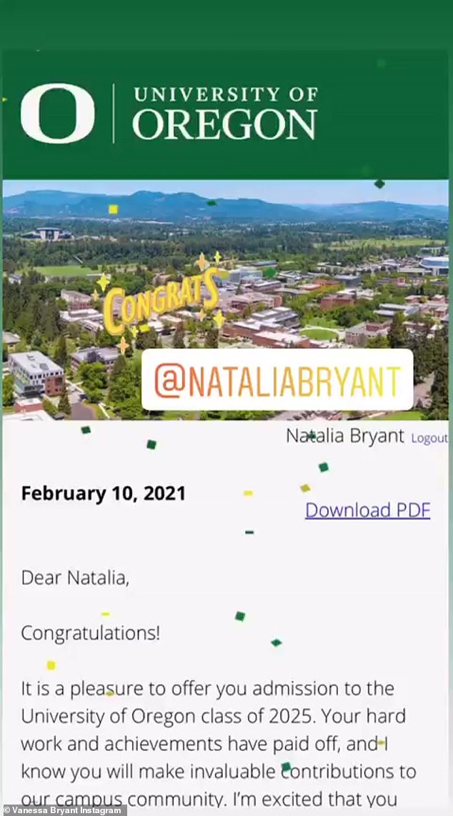 ▼之前凡妮莎還曾曬出納塔莉雅收到的俄勒岡大學(University of Oregon)的錄取通知書,通知書上寫道:「恭喜你!很高興向你發出俄勒岡大學2025屆錄取通知書。你的努力已得到回報,我們期待你繼續為我們的校園與社區做出寶貴的貢獻。」