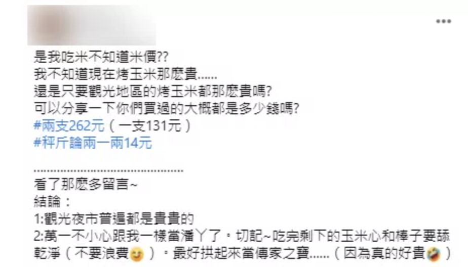 2021年03月17日夜市上的美食多種多樣,不用花太多錢就能吃好吃飽,但有時也會買到價格昂貴的小吃~日前一名女網友在臉書社團「爆怨公社」發文表示,她去夜市買2支烤玉米,結帳時才知道「2支262元,1支131元,秤斤論兩,1兩14元」。她非常驚訝,問:「是我吃米不知道米價?我不知道現在烤玉米那麽貴…還是只要觀光地區的烤玉米都那麽貴嗎?」