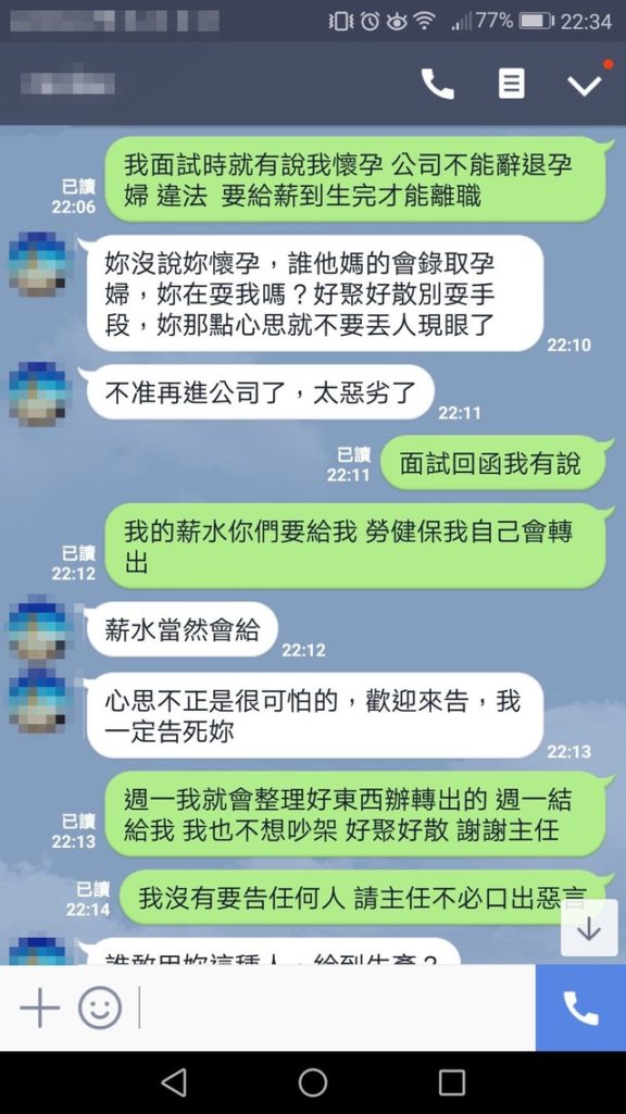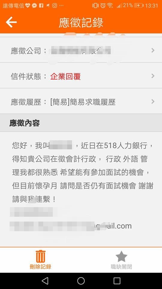 ▼原po表示,她當初面試回函的時候有明確告知自己懷孕的事。在人力銀行的應徵紀錄上,也能看到她問:「目前懷孕,請問是否仍有面試機會?」結果現在主管卻說她隱瞞懷孕,還說:「誰他媽的會錄取孕婦,妳在耍我嗎?好聚好散別耍手段,妳那點心思就不要丟人現眼了。」