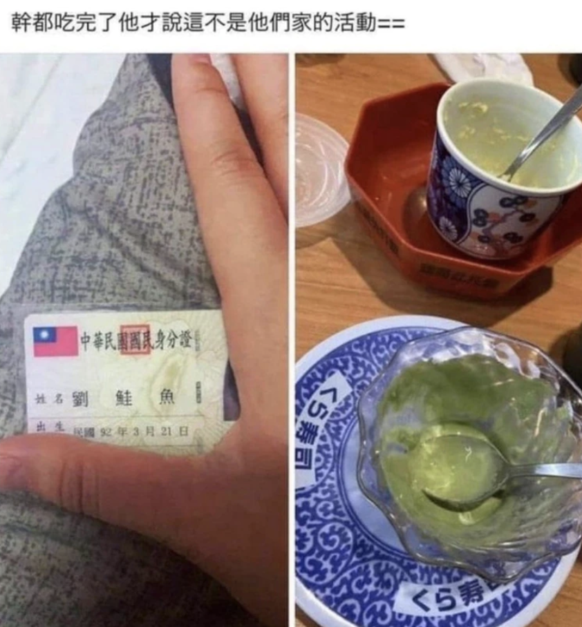 一位網友在臉書社團「爆廢1公社」po出一張身分證照片,上面的名字為「劉鮭魚」。原來這名劉姓網友為了到壽司郎吃免費壽司,跟風改名為「鮭魚」。他跑去飽餐一頓,結帳時店員卻說:「這不是我們家的活動。」他剛剛吃下的壽司全都要付帳!