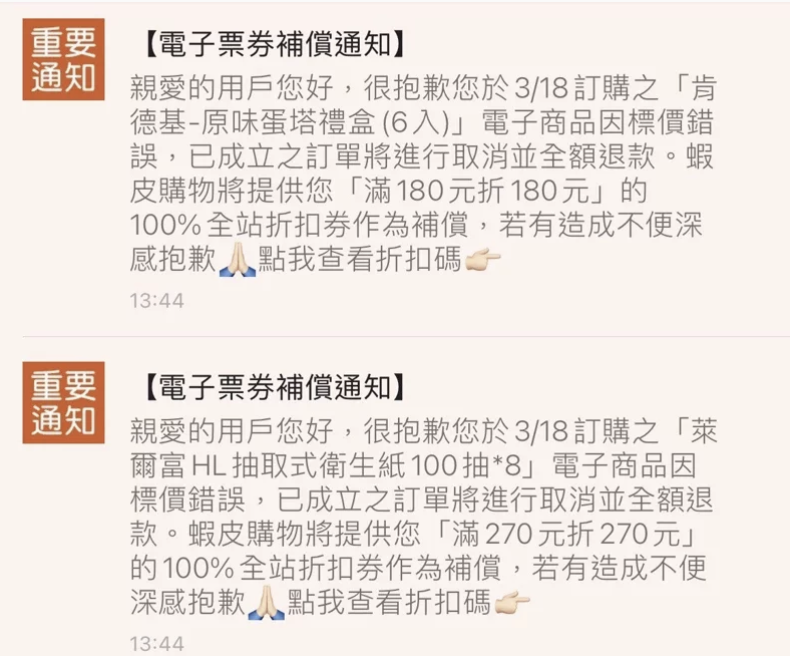 ▼另外3月18日已發送100%折抵的全站折扣券,蝦皮會免費贈送用戶,並且再延長使用期限3個月。針對這次蛋撻、衛生紙之亂,台北市法務局消保官已經介入瞭解,並多次與蝦皮公司溝通。法務局表示,只要契約已經成立,業者就不得片面解約,一旦標錯價,也只能認賠出貨。