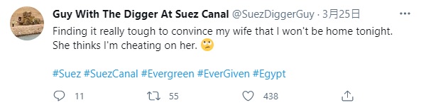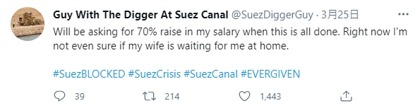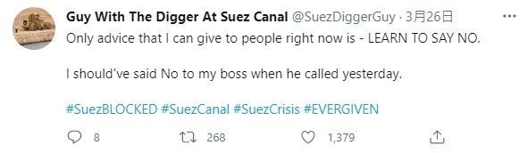 ▼「Guy With The Digger At Suez Canal」這個推特帳號是今年3月創立的,第一篇發文是在3月25日,也就是蘇伊士運河堵塞2天後。現在還不確定這是否真的是小挖土機司機本人的帳號,但po文內容風趣幽默,又非常真實,完美表達出了司機的心聲。再來看一下這些有趣的po文吧: