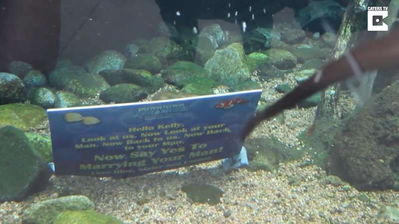 ▼當板子升起來後水獺也遊走了,只見上面寫著「Hello Kelly,看看我們,現在看看妳的男人。再回頭看看我們,然後再看看妳男人。現在快答應嫁給他!」
