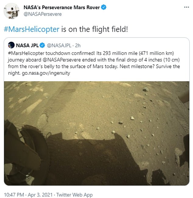 2021年04月08日美國國家航空暨太空總署(NASA)宣布,微型直升機「機智號」(Ingenuity)已經成功在火星著陸,正在為首次飛行做準備。機智號被固定在探測車「毅力號」(Perseverance)的車底,於2月18日降落在火星上。機智號最早將於4月11日在火星首飛。