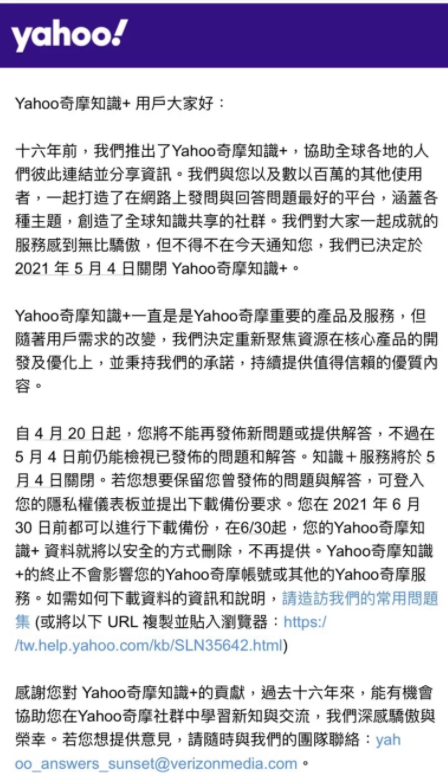用戶從4月6日開始陸續收到通知,Yahoo奇摩知識+團隊指出,16年前打造了在網路上發問與回答問題最好的平台,涵蓋各種主題,創造全球知識共享的社群,知識+一直是Yahoo奇摩重要的產品及服務,不過隨著用戶需求的改變,團隊決定重新聚焦資源在核心產品的開發及優化上。