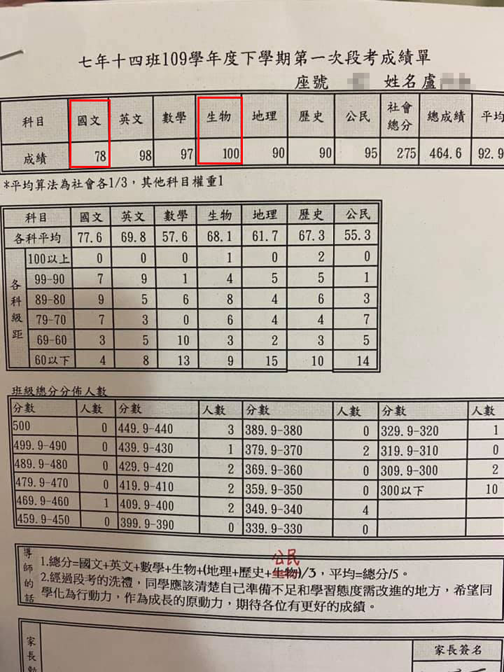 2021年04月09日日前一位女網友在臉書社團「爆怨公社」發文說,女兒現在就讀國中1年級,之前國文老師罵女兒「朽木不可雕也」,女兒決定用段考分數罵回去。原po貼出女兒第1次段考的成績單,網友們看到後感嘆:「國一這樣分數很棒耶!」