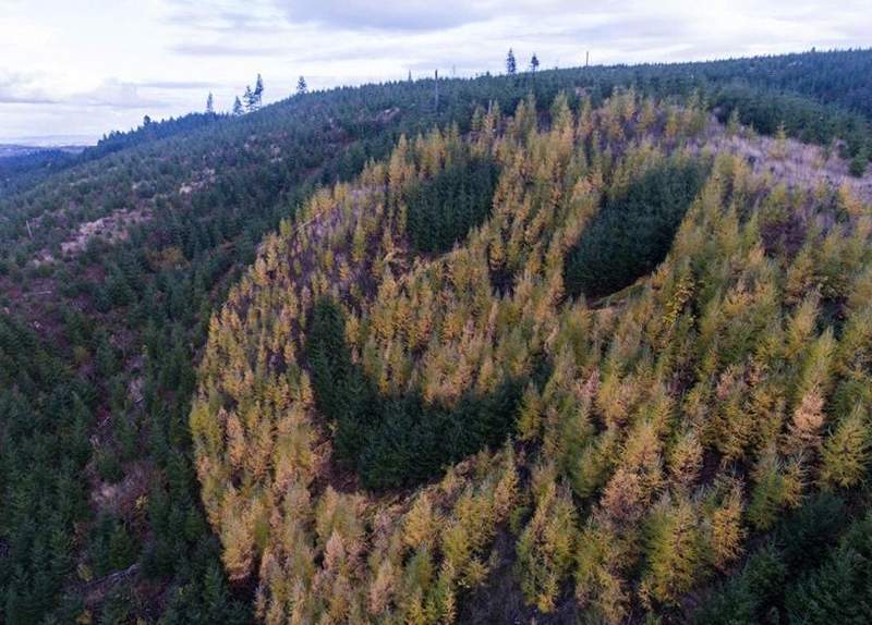 ▼這個笑臉是怎麼來的呢?原來這是漢普頓木材公司在2011年建的。他們用不同的植物組成了這個圖案。其中黃色的是落葉松,綠色的則是道格拉斯冷衫。隨著季節的變化,植物的顏色會改變,這個直徑有300英尺(約91.44公尺)的笑臉,就成為了這條路上最特別的風景。