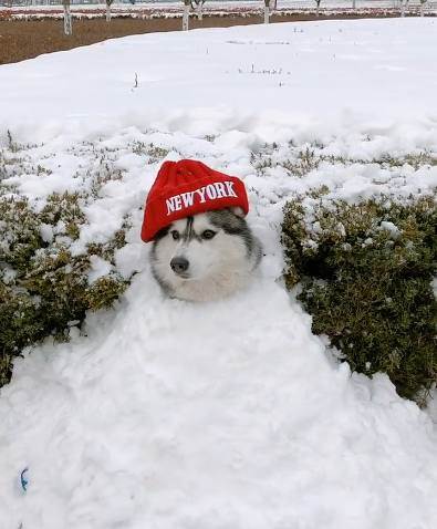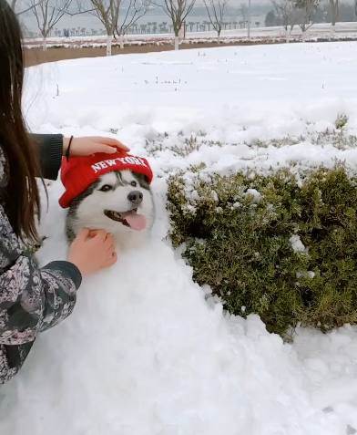 ▼前幾天下大雪,鏟屎官帶狗狗去雪地裡玩耍,一時興起想要堆雪人。鏟屎官讓狗狗坐好,然後將雪堆在牠的身上,讓牠露出腦袋,再戴上紅色的帽子,一個喜慶的哈士奇雪人就堆好了!