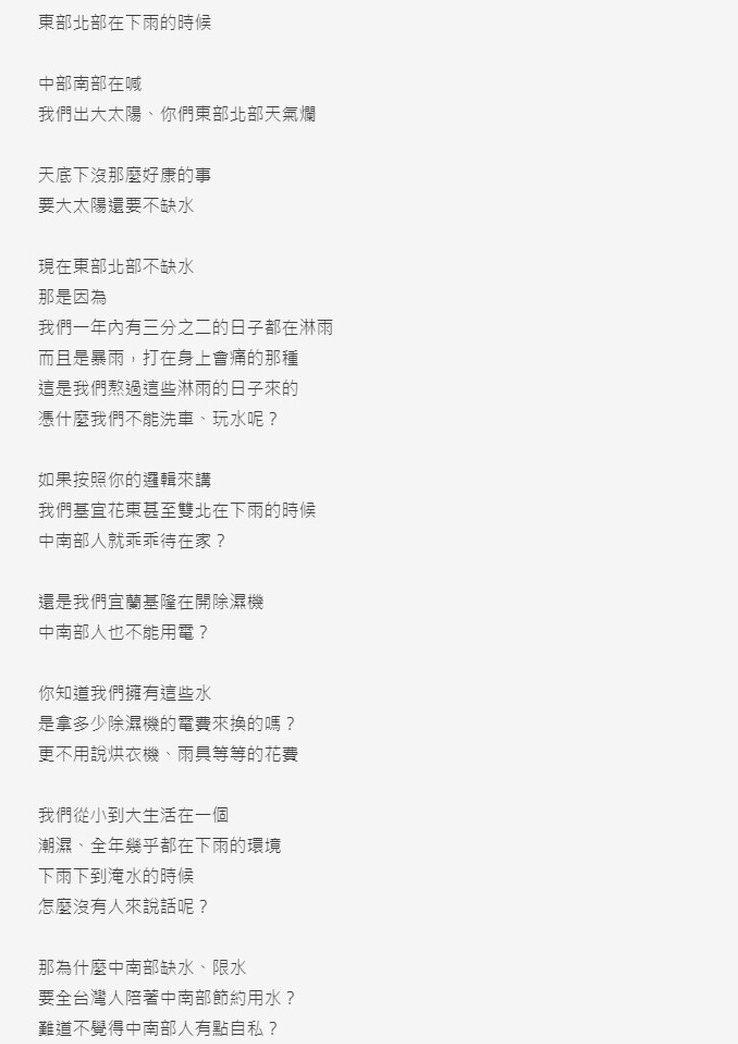 ▼這位男大生表示,北部東部的人從小就生活在全年潮濕、幾乎都在下雨的環境裡,「你知道我們擁有這些水,是拿多少除濕機的電費來換的嗎?」他質疑「為什麼中南部缺水限水,要全台灣人陪著節約用水?」、「憑什麼我們不能洗車、玩水呢?」