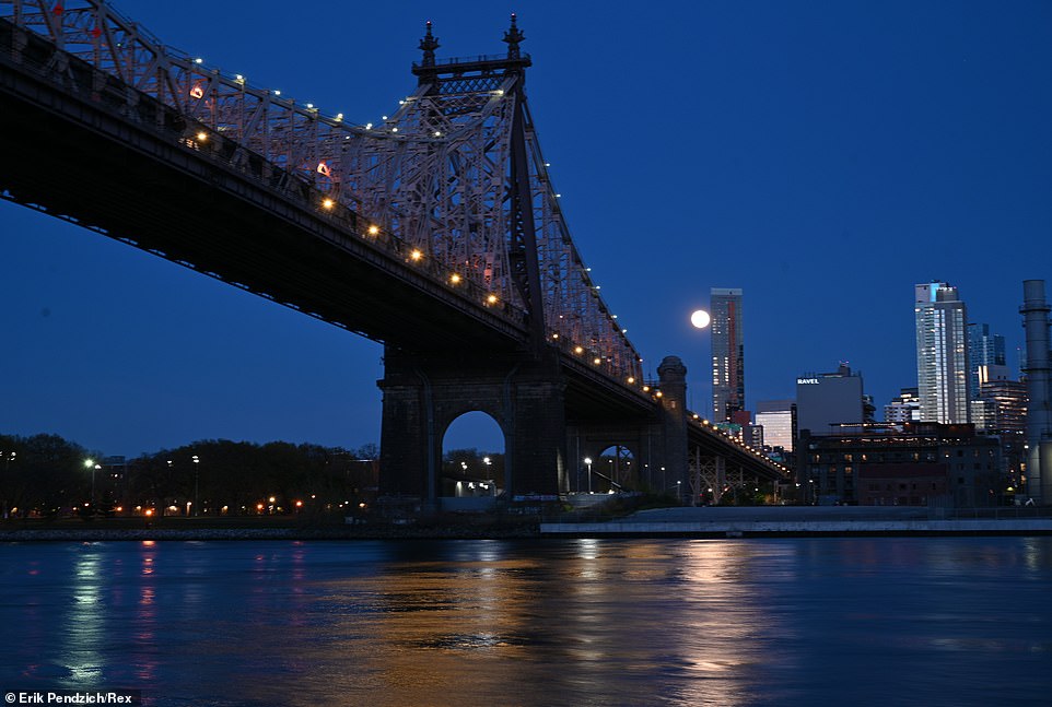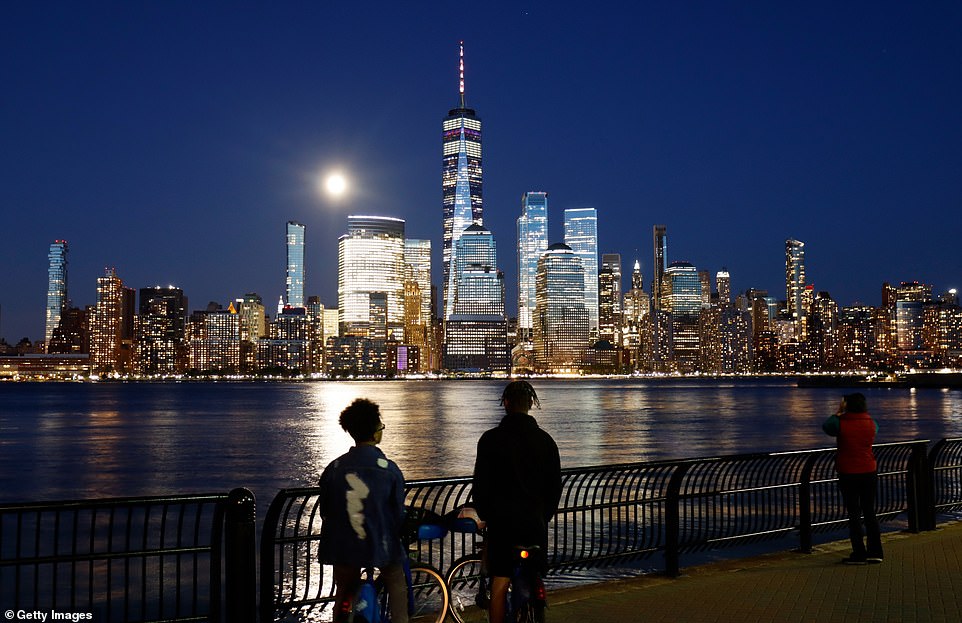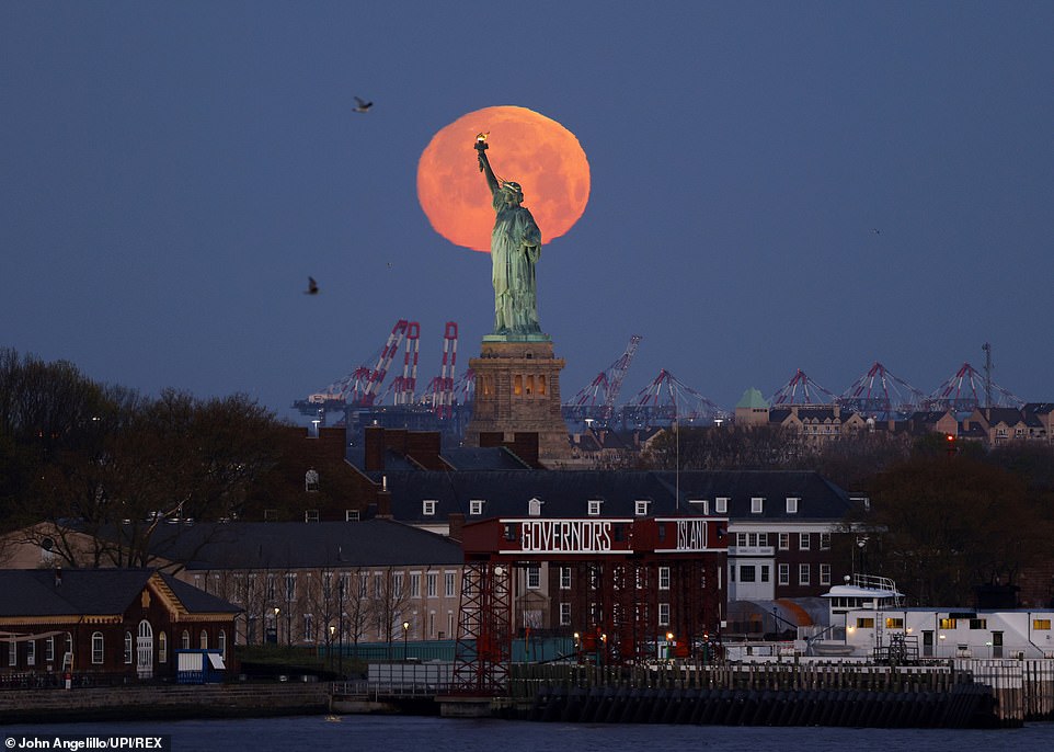 絕美!「超級粉紅月亮」點亮紐約夜空 與自由女神像交相輝映