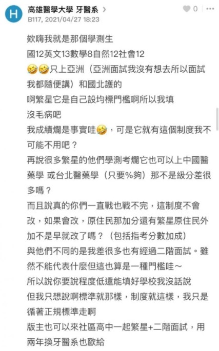 這名高中生表示,他有參與二階面試,「雖然不能代表什麼,但這也算是一種門檻哇」。他不否認自己的成績差,但自己是按照正規標準申請上高醫牙,並沒有走旁門左道,「版主也可以來社區高中一起繁星+二階面試,用兩年換牙醫系也歐給(OK)。」