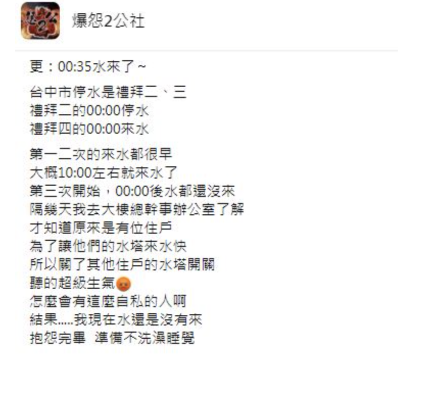 原po表示,台中市的停水時段為星期二、星期三2天,自星期二0時起停水,星期四0時起復水。前兩次停水完後家裡很快就會來水,有時候提前到22時就有水用。沒想到第三次停水完後,水卻遲遲沒有來。她本想等來水後再洗澡,但等到半夜都沒等到。