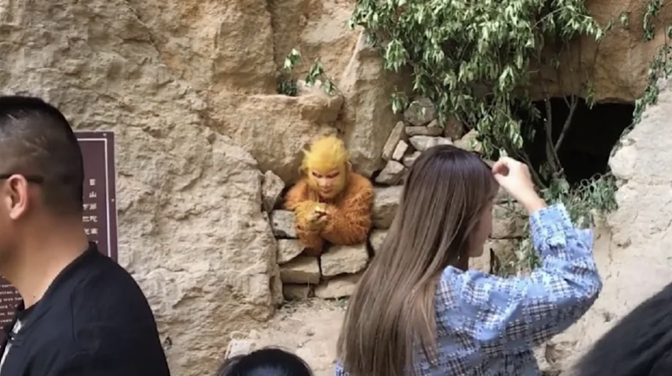 ▼這一風景區位於河北邯鄲,五一假期遊客眾多,景區推出全新的互動活動,請一名男性工作人員裝扮成孫悟空,鑽進一座假山下的山洞裡,只露出上半身,還原孫悟空被壓在五指山下的模樣。工作人員很敬業,果然有很多遊客前來拍照打卡。