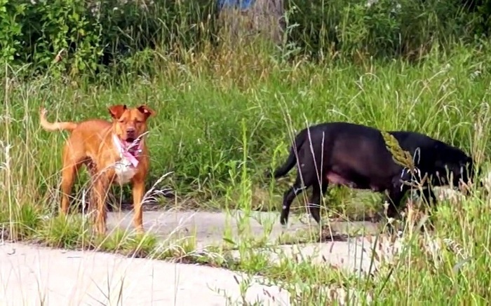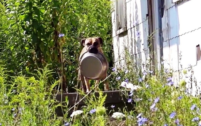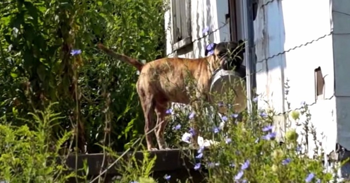 ▼只見一隻流浪狗叼著空鐵盆,站在空無一人的房屋外。牠似乎是想碰碰運氣,看看會不會有好心人給牠食物。但牠走過一間又一間房子,都沒有人出來。原來這是一個廢棄的住宅區,所有的房子都空蕩蕩的,院子裡的雜草比人還要高,不可能有人出來餵狗狗。