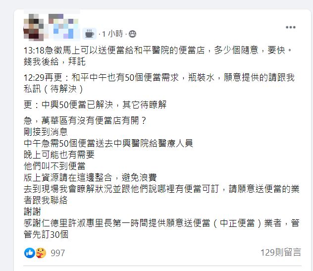 ▼台北市萬華區是這次疫情的重災區,很多店家都配合政府防疫,宣布暫停歇業,這讓醫護人員非常苦惱。一名網友在臉書社團「我是萬華人」發文,詢問萬華區是否還有便當店營業,因為中興醫院的醫護中午需要50個便當與瓶裝水,晚上應該也需要,他們實在叫不到便當,希望網友留言幫忙整理店家。