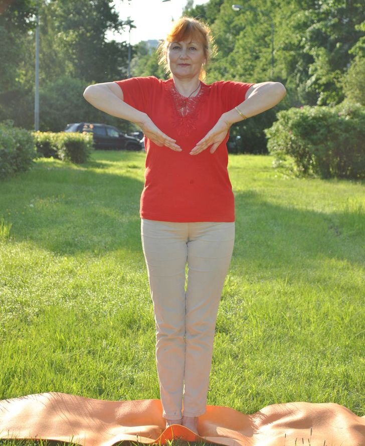 ▼6.雙手合十:雙手合十、手臂緊貼,將手往上平舉,再慢慢地往下,堅持30秒。