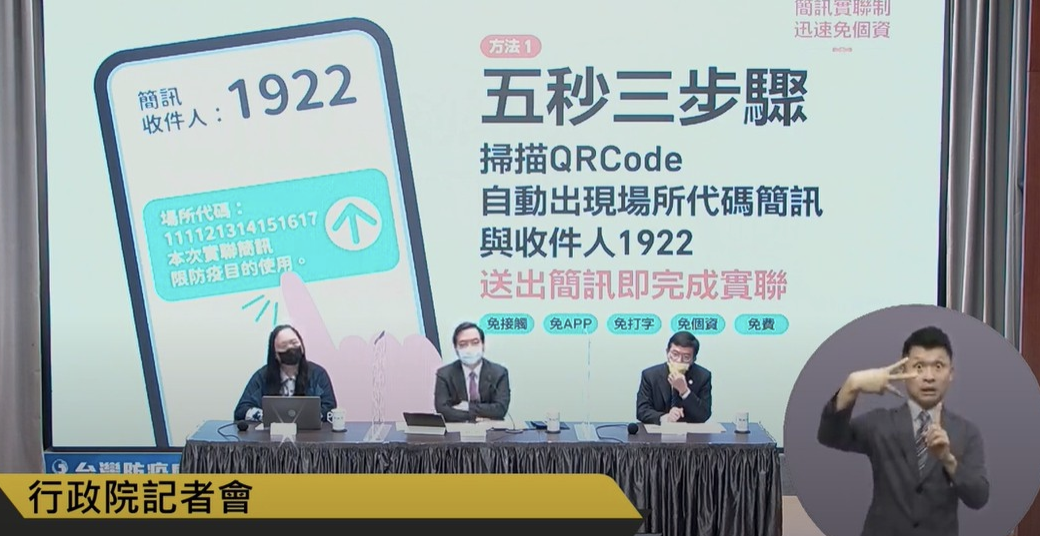 2021年05月19日因應疫情升溫,各大場所及餐飲業者必須實施「實聯制」。很多商家提供QR Code或紙本方式讓民眾填寫。為解決不便,政委唐鳳開發「簡訊實聯制」,只要掃描QR Code,不需要填寫個人資料,以簡化流程。行政院在19日的記者會上發布了「簡訊實聯制」的詳細做法。