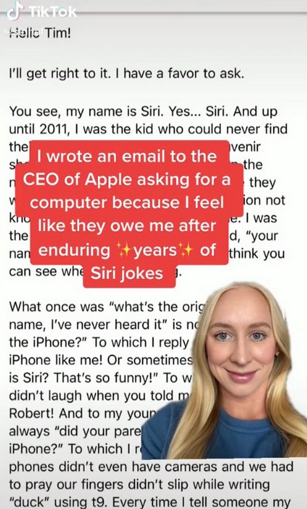 ▼Hafso覺得蘋果公司給自己的生活造成了困擾,她給蘋果執行長Tim Cook寫信索賠,要求蘋果免費送給她一台筆記型電腦作為30歲生日禮物。她在抖音上說:「我給蘋果執行長寫了一封電郵,要求他們免費送我一台筆電。這麼多年來我忍受了無數跟Siri有關的笑話,這是他們欠我的!」