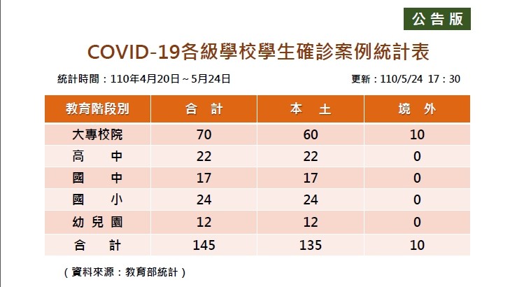 2021年05月25日全台防疫警戒提升至第三級,各縣市相繼傳出確診病患。據教育部今日(25日)公布全國各級學校確診人數,截至24日17時30分,全台學生染疫人數為145人,比前一天增加27人。教育部發函至高中以下學校,表示疫情仍嚴峻,請各個高級中等以下學校、幼兒園畢業典禮配合停辦。若需辦理,請學生以線上方式參與,避免不必要的移動、活動或集會。
