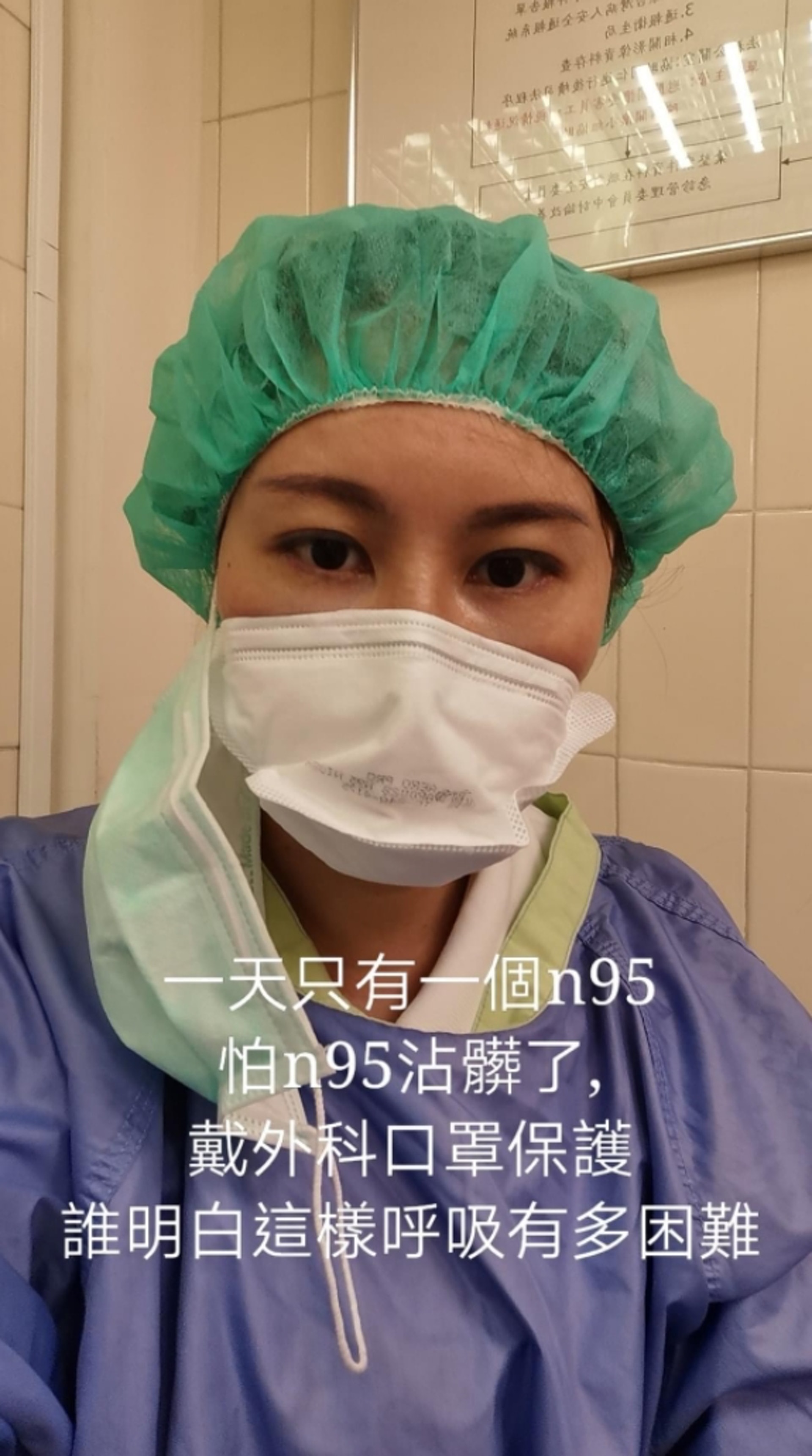 ▼她po出自己穿著防護衣、戴著口罩的照片,「額頭上的帽子壓痕,還只是其中一條壓痕,口罩拿下來,壓到連法令紋都很深」、「一天只有一個N95口罩,怕用髒所以戴外科口罩保護,誰明白這樣呼吸有多困難」。她還呼籲民眾乖乖待在家中,外出戴好口罩,「請用行動宅在家支撐第一線醫護」。