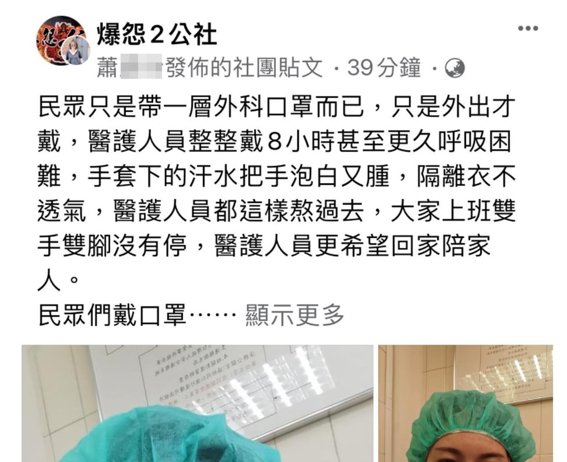 2021年05月27日本土疫情嚴峻,第一線醫護承受著巨大的壓力。一位醫護人員在臉書社團「爆怨2公社」po文說,自己每天上班都包得密不通風,戴著手套、口罩,連呼吸一口新鮮空氣都覺得奢侈。她喪母期間想回家探望,又擔心醫院中人手不足,不敢隨便請假。她拜託大家乖乖配合防疫。