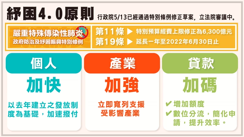 日前行政院向立院提出審查嚴重特別傳染性肺炎防治及紓困振興特別條例修正草案,將總預算額度上限調高為6,300億元,讓紓困規模更大,並將期限延長一年。行政院也緊急規劃紓困4.0方案。行政院預計在6月3日行政院會討論通過特別預算案~