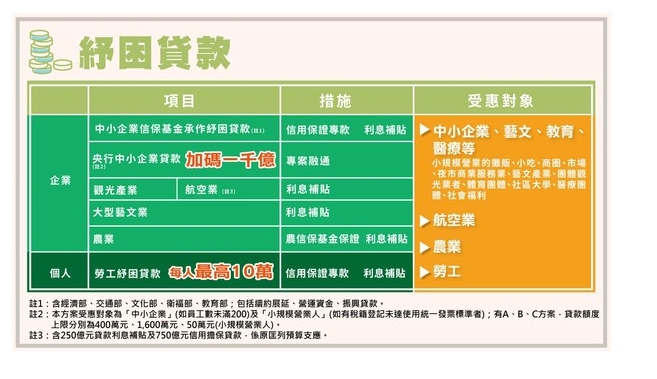 除了去年原先的編列金額外,去年央行對中小企業的紓困額度為3千億元,這次將再加碼1千億元;勞工紓困貸款部分,現在有90多萬人受惠,再另外提撥500億元額度,可再讓50萬勞工受惠,去年申請者亦能再次申請。
