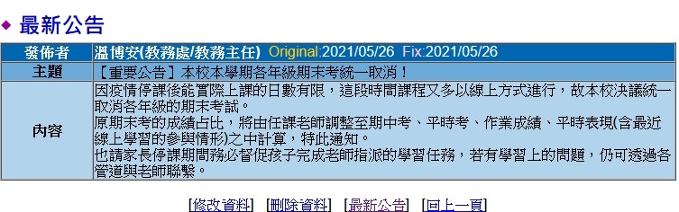 ▼北市南湖國小表示,因疫情停課後,實際上課的日數有限,這段時間的課程多以線上方式進行,所以本校決議統一取消各年級的期末考試。原期末考的成績占比,將由任課老師調整至期中考、平時考、作業成績、平時表現(含最近線上學習的參與情形)之中計算,特此通知。