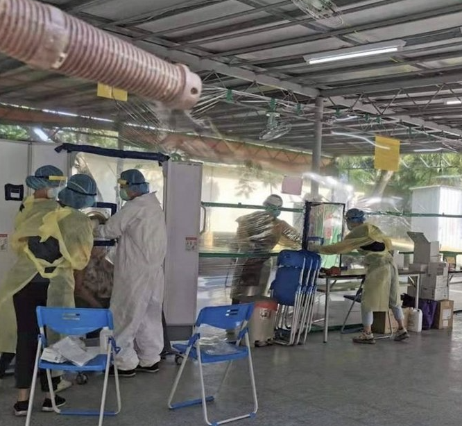 這幾天屏東白天高溫達攝氏38度以上,快篩站裡沒有冷氣,醫護人員穿著密不透風的防護衣,工作一段時間就汗流浹背。羅一鳴醫師說,自己會趁著篩檢的人少時,脫下防護衣喝水、休息一下。縣府準備的資源充沛,醫護人員可以在休息後更換新的防護衣,所以他並不擔心自己是高危群體。