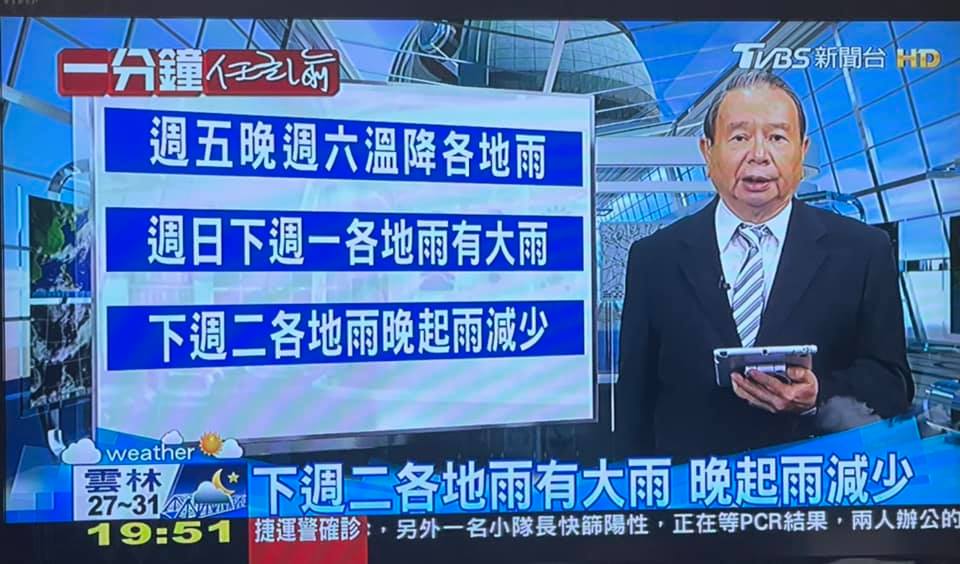 ▼詹怡宜表示,任立渝早就有退休的念頭,之前也曾延後離開的時程,如今因為疫情不好再延,所以他31日最後一天上班。「講了50年天氣,也該過輕鬆生活了。」、「『疫情中大家不注意這個,剛好我就靜靜退吧』,這可能正好符合任大哥低調的性格。」