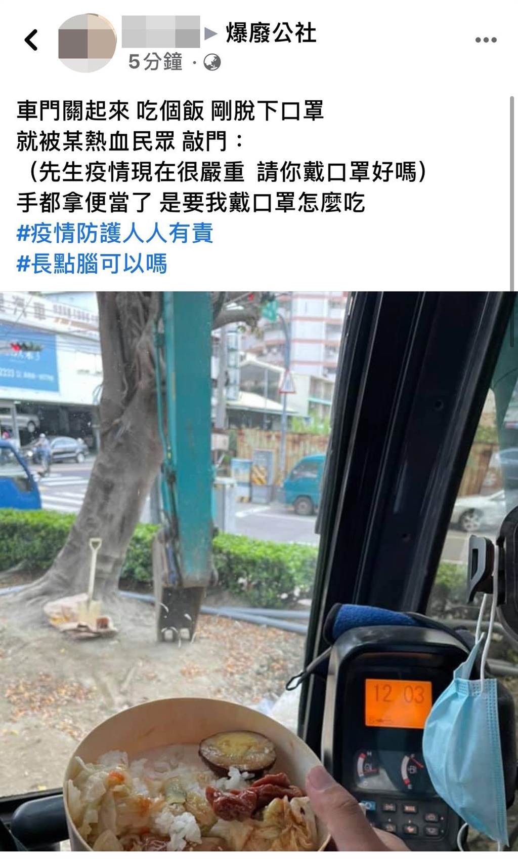 2021年06月01日疫情嚴峻,全台升至三級警戒,民眾外出必須戴口罩,否則將被開罰。一些戶外工作者非常無奈,連吃飯、喝水都要偷偷摸摸,深怕被人檢舉。一名網友在臉書社團「爆廢公社」po文說,他獨自一人關著車門在車內吃便當,竟然有人敲窗提醒他戴上口罩。他無奈問:「要怎麼吃?」