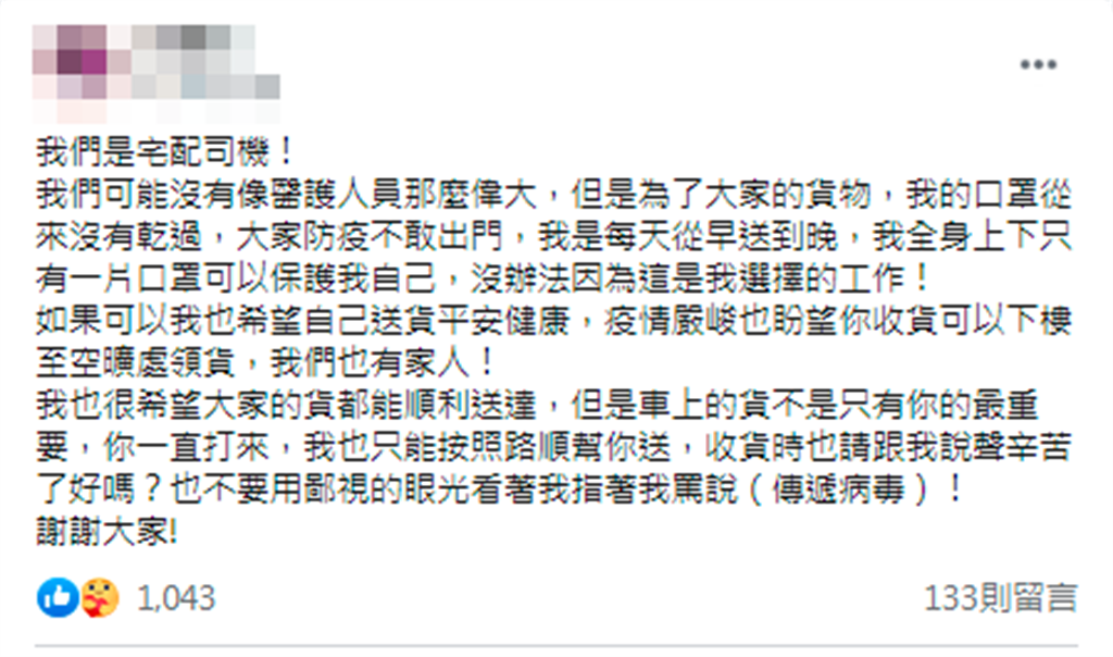 2021年06月01日本土疫情升溫,三級疫情警戒持續至6月14日。很多民眾為減少外出改為網購,透過線上下單採買生鮮蔬菜或家庭用品。一名宅配司機24日在臉書社團「我是艋舺人」發文說,自己也許沒有醫護人員那麼偉大,但為了完成工作,口罩幾乎沒有乾過。他希望客戶收到商品時能夠到空曠處領取,這是在保護自己也保護他人~