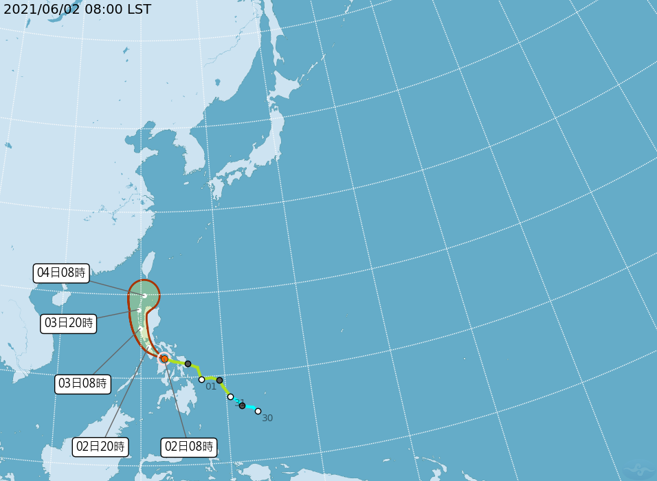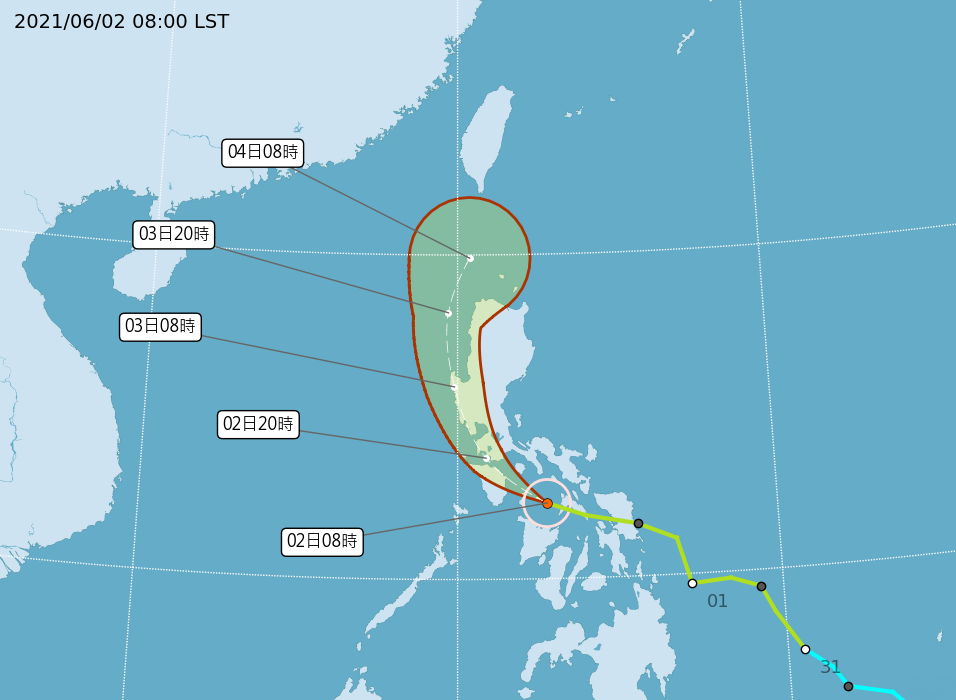 2021年06月02日根據中央氣象局資訊,今天(2日)各地高溫回升,西半部高溫約34、35度,東半部31至33度,感受上稍微悶熱,應多多補充水分。氣象專家吳德榮在「三立準氣象.老大洩天機」專欄表示,第3號颱風彩雲大致在呂宋島北轉,受菲律賓地形破壞,進入巴士海峽時已減弱為熱帶低壓;再轉向東北,結構持續受垂直風切破壞,對台無威脅。週五其殘餘水氣將接近台灣,到時天氣不穩定度提高,午後對流也會增強~