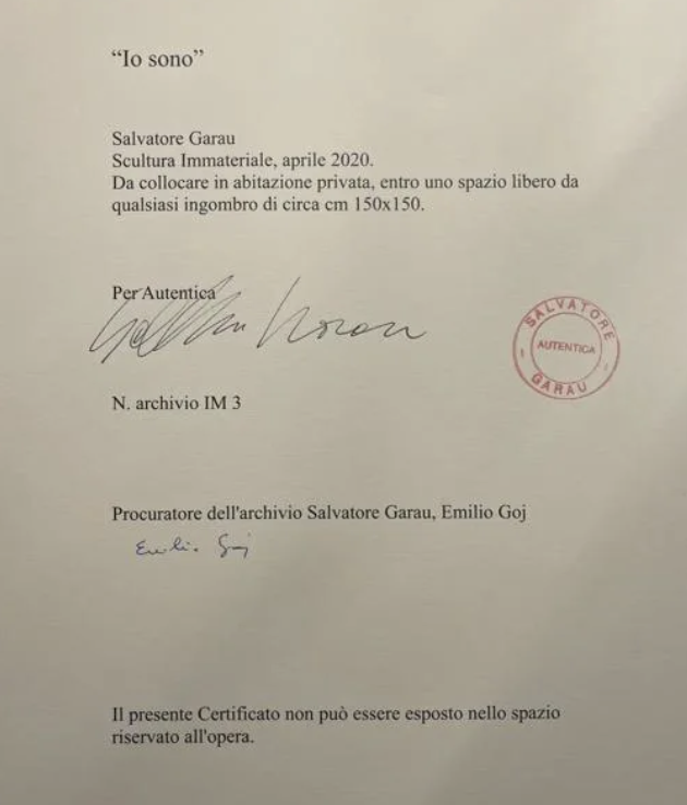 2022年06月15日看不見的藝術品,到底是否存在?義大利藝術家Salvatore Garau創作了一件名為「Io Sono」的藝術品,這是一件「隱形的雕塑」,你看不見,也摸不到,只存在於Salvatore的想像中。沒想到這座隱形雕塑真的賣出,而且超受歡迎!不過買家花了一大筆錢,除了一張證書之外,什麼都拿不到。