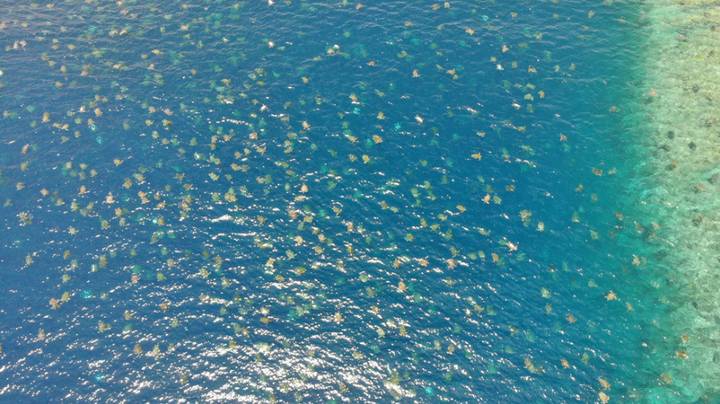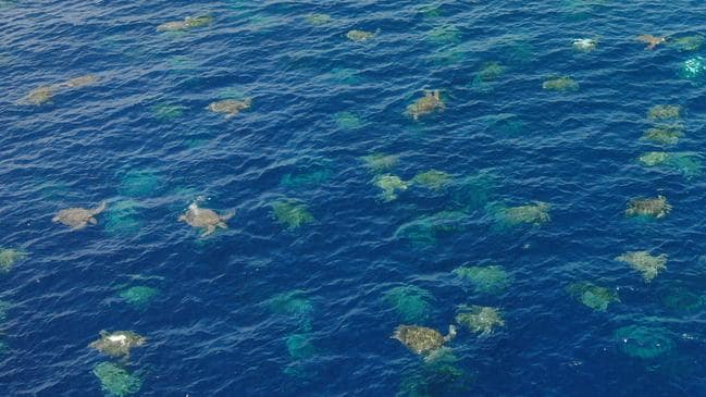 2022年06月11日最近澳洲科學家用無人機拍到了一段壯觀的影片。大堡礁附近的海水中有無數隻綠蠵龜,牠們正準備爬上沙灘築巢,產卵繁衍後代。從畫面中粗估,這次集體趕去產卵的綠蠵龜大約有6.4萬隻。