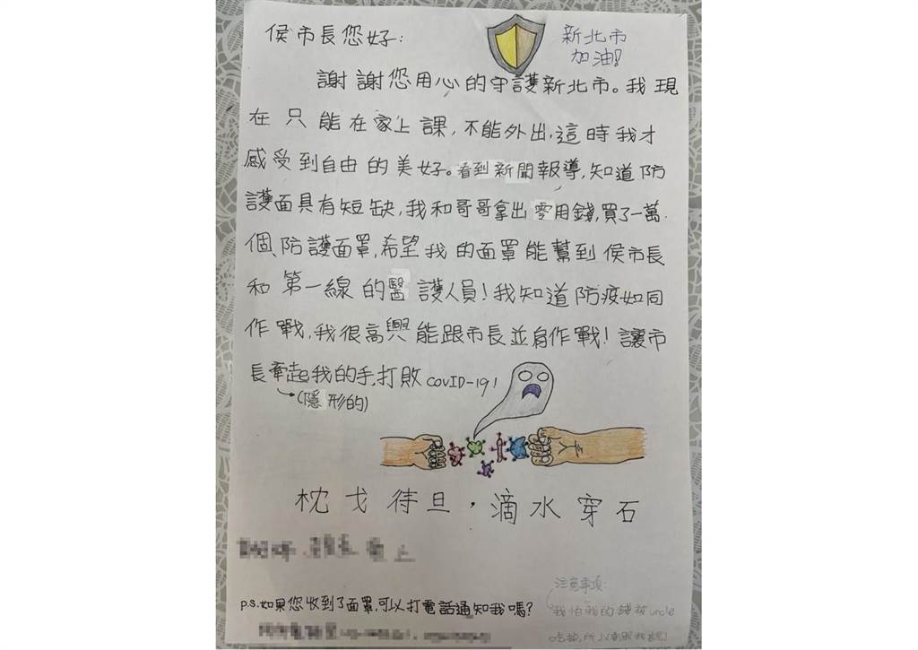 ▼信的最後,這對可愛的兄妹特別備註:「如果收到面罩可以打電話通知我嗎?我怕我的錢被叔叔吃掉,所以要跟我說。」侯友宜笑回,面罩已經收到了,小朋友真的很可愛,謝謝他們的愛心,市長會繼續努力,對抗病毒。