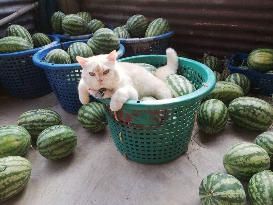 我不想顧攤! 臭臉貓賣西瓜「一臉不爽」 瞪到客人叫不敢:快買一買讓朕早點下班