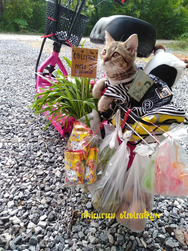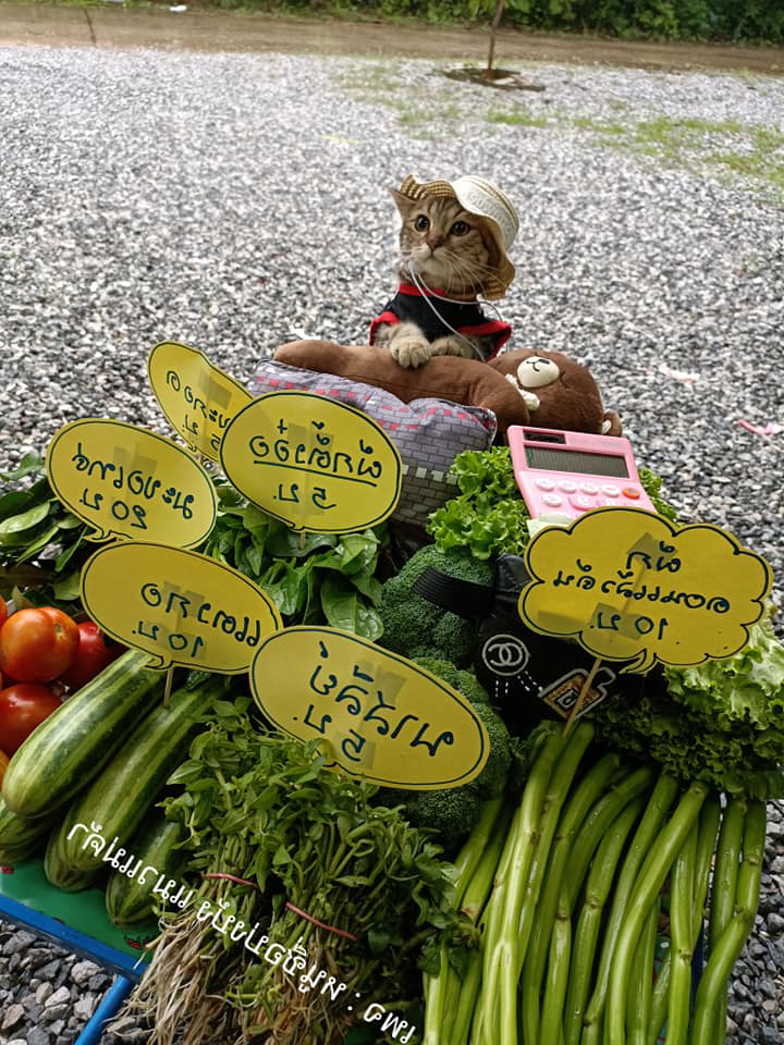 ▼這隻「貓咪攤販」叫Bong Bong,牠憑藉可愛的模樣在網路上掀起討論。尤其是牠坐在路邊賣菜的照片,看起來格外有趣。牠坐在小型電動椅上,一臉認真望著前方的蔬菜,就像真正等待顧客上門的攤販一樣。