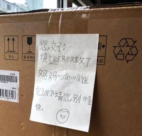 ▼那名7歲的小女孩聽到郭彪鄭的這通電話,悄悄寫了一張紙條貼在冷氣機包裝上,紙條上寫著:「您好,快遞叔叔救了媽媽,耽誤送空調了,請您別怪他。」王姓女子本來很氣送貨員遲到40分鐘,但看到紙條後馬上消氣了。