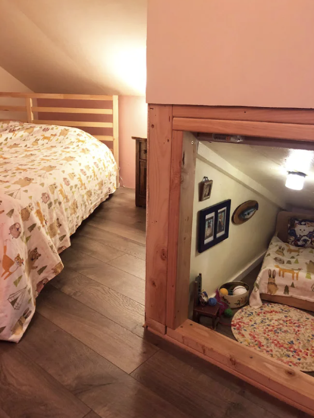 ▼Bryan改造小空間的牆面,還裝上燈泡,並添置小床等傢俱。他還在牆上掛了一些貓咪主題的畫,來增添品味和格調。