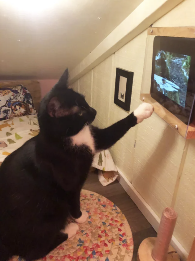 ▼Bryan知道愛貓很喜歡看自然風景,喜歡看飛鳥和小松鼠,就將平板電腦安置到牆上,每天播放自然主題的影片。平板就像小窗口一樣,Wyatt每天都能透過它看到美妙的景色。