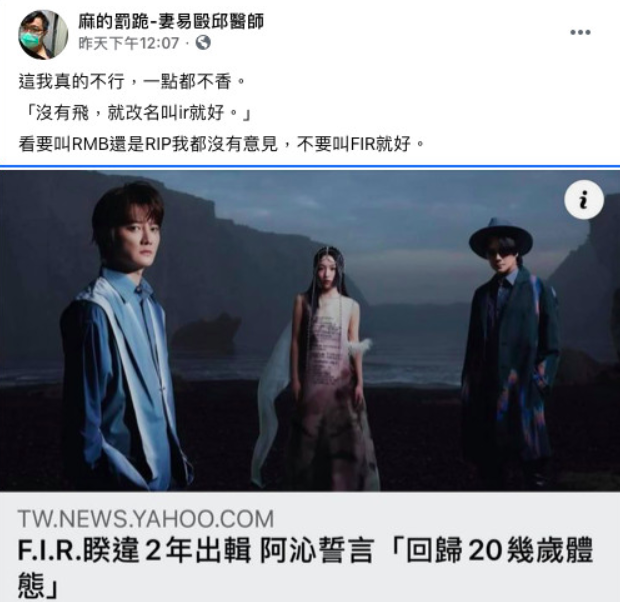 ▼網紅「麻的罰跪-妻易毆邱醫師」在臉書上有近8萬粉絲追蹤,8日在臉書粉專表示:「這我真的不行,一點都不香。『沒有飛,就改名叫ir就好。』看要叫RMB還是RIP我都沒有意見,不要叫FIR就好。」更表示:「這就像楊培安唱的大海沒有不好,可是 #沒有人能取代張雨生。」