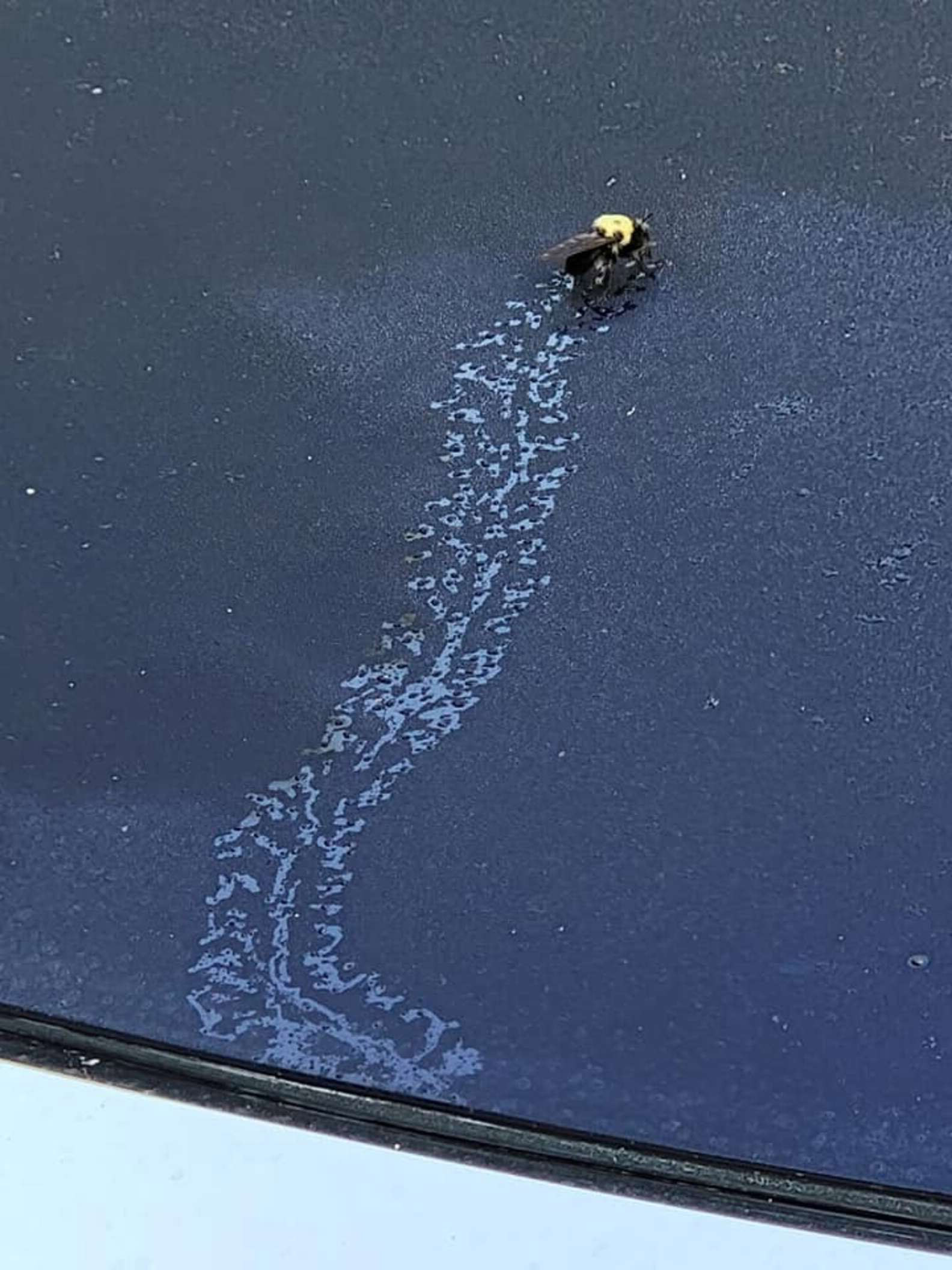 2021年07月15日日前國外網友Alice Penix買了一部新手機,她想試試手機的相機功能,希望捕捉到一些精彩的畫面。正在這時,她注意到一隻大黃蜂落在她的前車窗上。清晨時分車窗上佈滿露珠,大黃蜂慢慢爬過,留下一條清晰的路徑。Alice立刻意識到,這就是最棒的拍照素材~