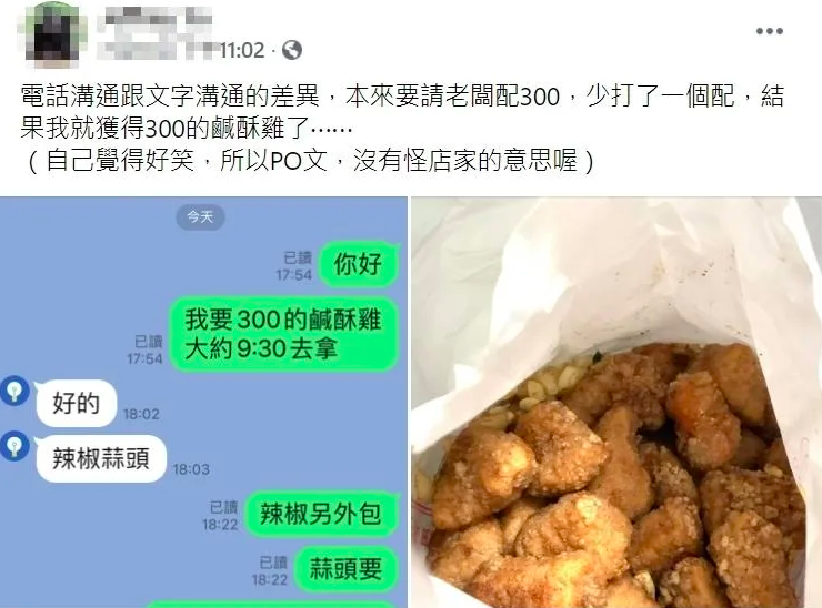 點300元鹹酥雞!他用LINE訂餐「少打1字」釀慘劇 送來時笑爆網友