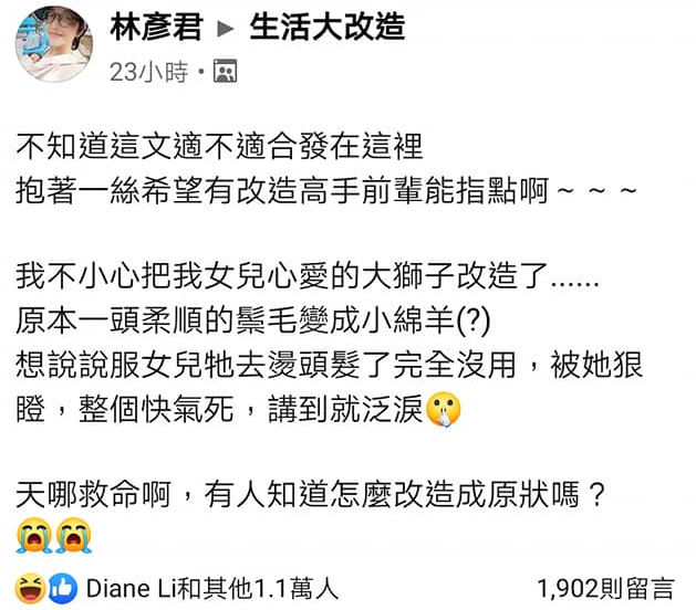 ▼雄獅的鬃毛捲曲後已經無法挽救,她只能用「公獅去燙頭髮」的理由來說服女兒,但女兒完全不為所動,還是非常難過。原po將這件事分享出來,並向網友們求救:「天哪救命啊,有人知道怎麼改造成原狀嗎?」