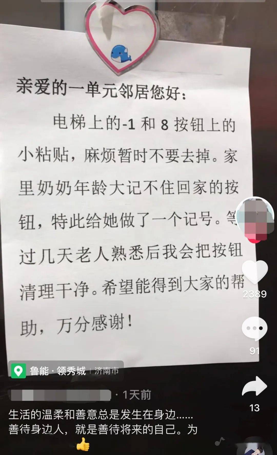 ▼這棟大樓的一位住戶搭乘電梯時,發現8樓和B1的按鍵上貼有碎花貼紙,旁邊還有一張紙條。紙條是一位住戶貼的,她請求鄰居們暫時不要撕掉按鍵上的貼紙,因為家中奶奶年紀大了,記不住回家的樓層按鍵,所以特別貼上貼紙做記號。這位住戶表示,等過幾天老人家熟悉環境後,就會將按鍵清理乾淨,她很感謝大家的理解和包容。