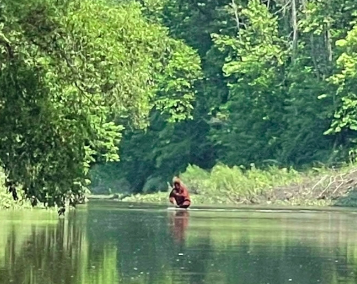 ▼Eddie表示,他的表兄在卡斯河上划皮艇時,突然看到了一個神秘的身影。他說:「我不確定那是什麼,我已經將影片寄給一些人看過了。有的人說那是大腳怪帶著小寶寶,也有人說那是大腳怪叼著一隻鹿。」