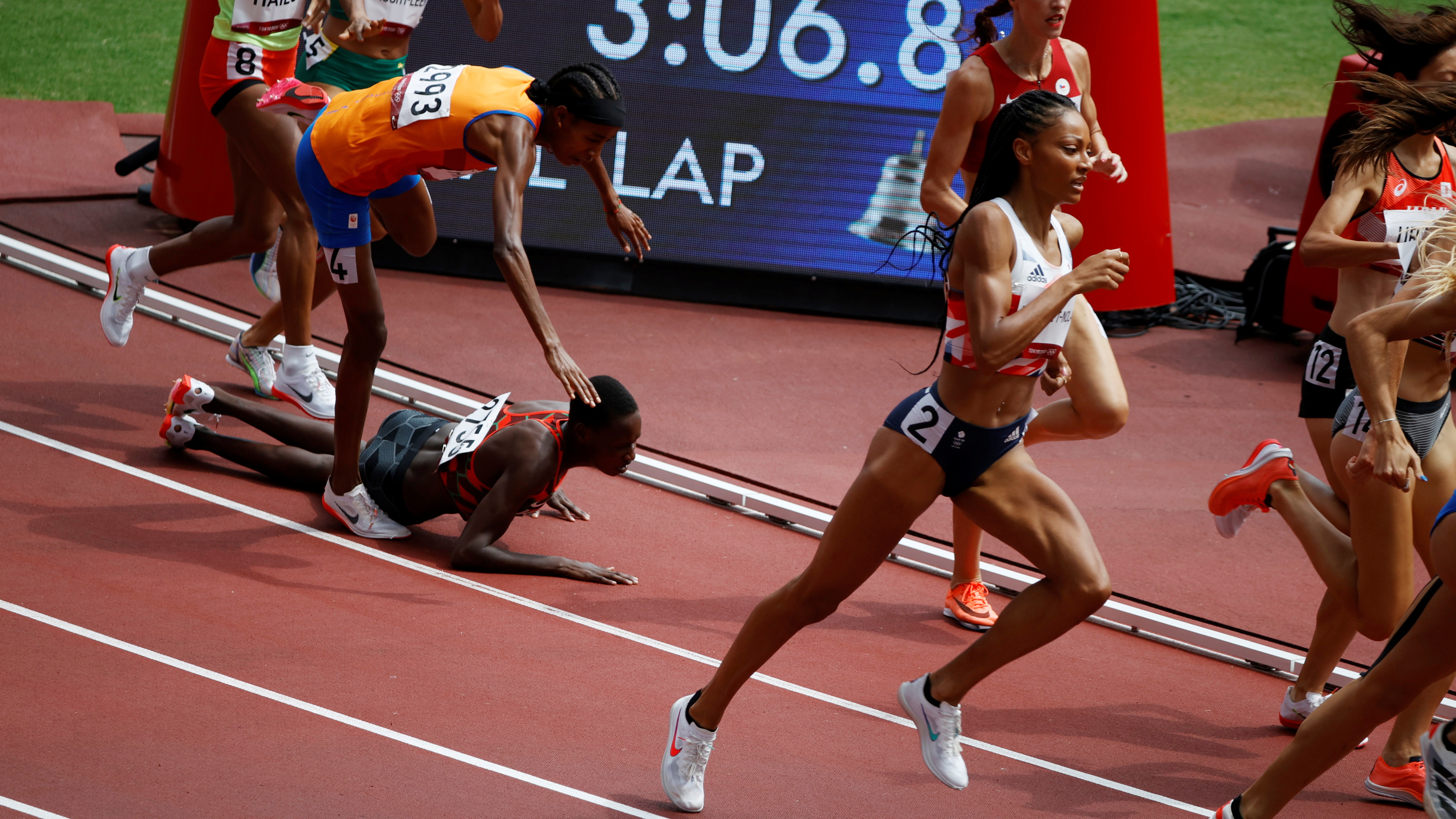 ▼早在比賽之前,Sifan就被認為是1500公尺項目的金牌熱門人選,她果然沒有讓人失望!7月2日預賽進行到倒數一圈時,一名選手突然跌跤,Sifan就在那名選手後方,所以被波及倒地。兩人落到最後,眼看就要晉級無望。