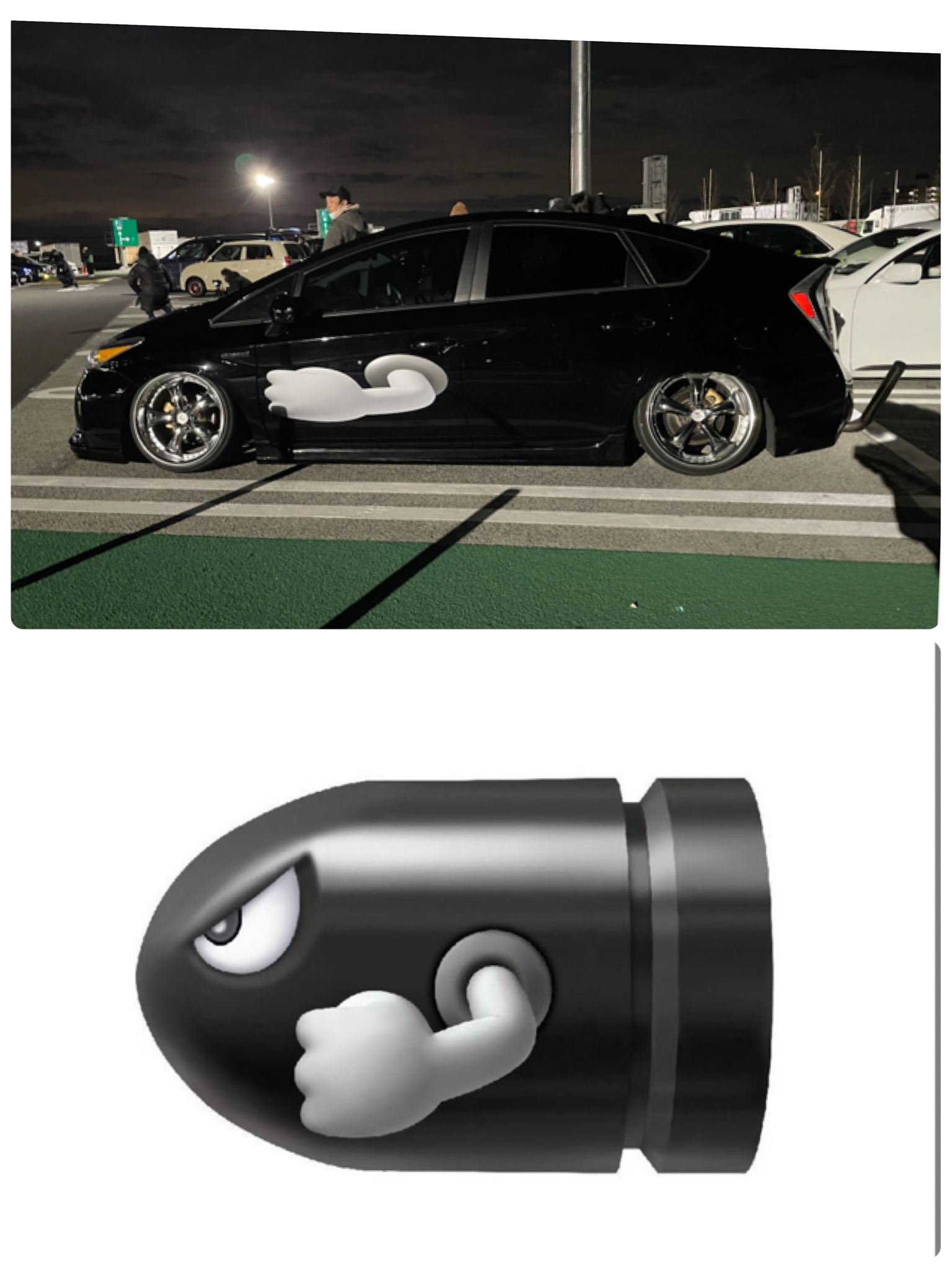 ▼除了汽車內部,車身外部也有改裝。黑色的車身上有白色的手手,跟車燈組合起來就像任天堂的子彈殺手。開著這輛車上街,其他車主和路人一定會驚嘆連連。